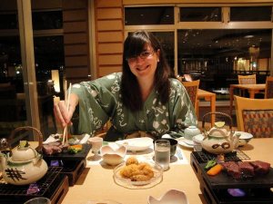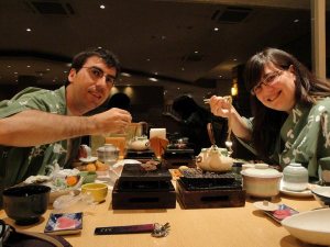 Vaya pedazo de sopar. Ens vestim amb les yukates (bates d’estil japonès) i fem un menú degustació de més de 10 plats diferents.