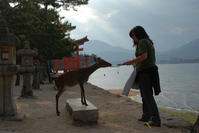 Per tota l’illa passegen cérvols que s’apropen per robar-te alguna cosa de menjar. Deuen ser els únics lladres que ens hem trobat a tot el Japó!!! Aquí la gent sembla incapaç de timar-te (un home d’una botiga on vam dinar, va sortir corrents darrera nostre perquè s’havia equivocat amb el canvi i ens tornava el que ens devia). No ens estranya que quan els japos vénen a Barcelona…