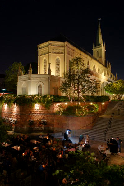 Trobem un antic convent reconvertit en zona de restaurants i bars.  “Chijmes” es diu. O sopem a la vora del riu Singapur…