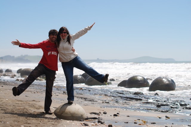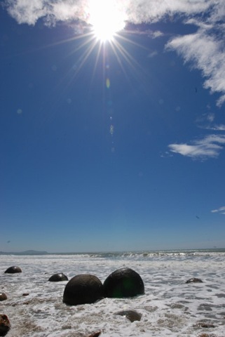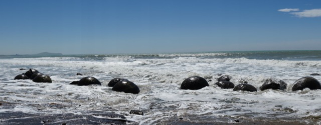 Dia molt complet. Aparquem la caravana al costat de la platja per veure les Moeraki Boulders, que són unes grans roques amb formes esfèriques. Arribem quan la marea està pujant, i això ens dificulta fer les fotos. L’aigua puja ràpidament i acabem mullant-nos les sabates i part dels pantalons. Sort que podem canviar-nos a la caravana…