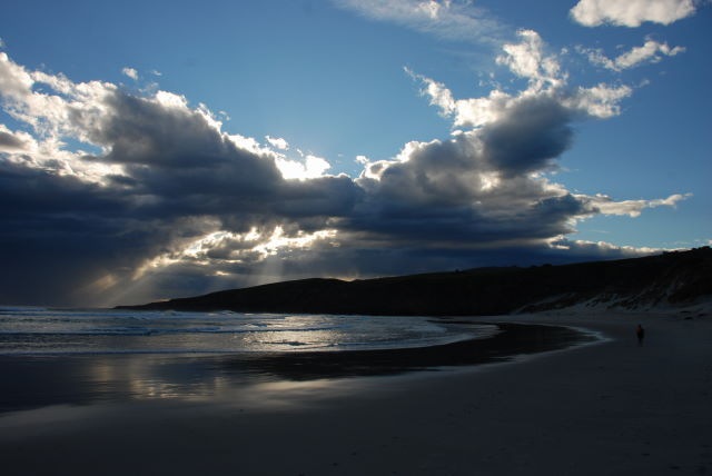 Al vespre ens apropem a la platja de Sandfly Bay. Per arribar hem de fer un llarg recorregut des del lloc on aparquem. El sol comença a caure i les vistes són inmillorables. La baixada és fàcil, però quan tornem és un esforç sobrehumà pel nostre estat físic.