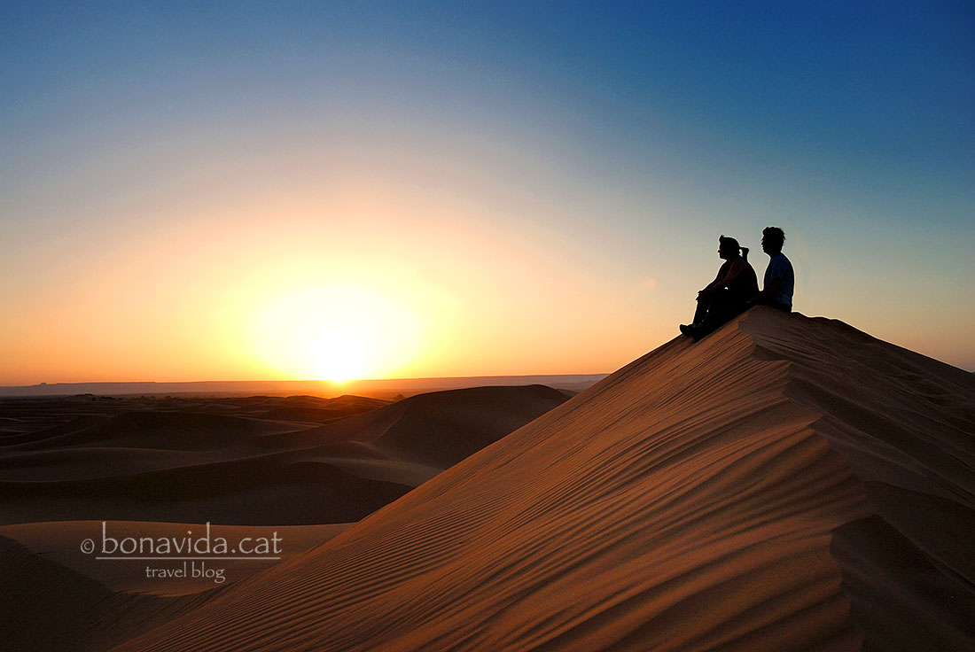 Després d’una ruta en 4×4 sortint des de la població d’Erfoud, a l’est del Marroc, abandonem el cotxe i el canviem per un parell de dromedaris. Durant dues hores passegem amb aquest vehicle animal per uns paratges increïbles. Una sorra fina i un enorme silenci és tot el que ens envolta. El nostre guia és un jove marroquí, al que no fem més de 15 anys, poc xerraire, però sempre amb un somriure a la cara. Finalment un grup més gran de turistes, també sobre dromedaris, se’ns uneix, i fem la part final del trajecte tots plegats. El sol comença a marxar, i és llavors quan el desert arriba al seu màxim esplendor. La sorra sembla vermella com el foc i les ombres s’allarguen fins a límits insospitats. És llavors quan divisem una petita àrea verda, amb algunes palmeres, sota una enorme duna.