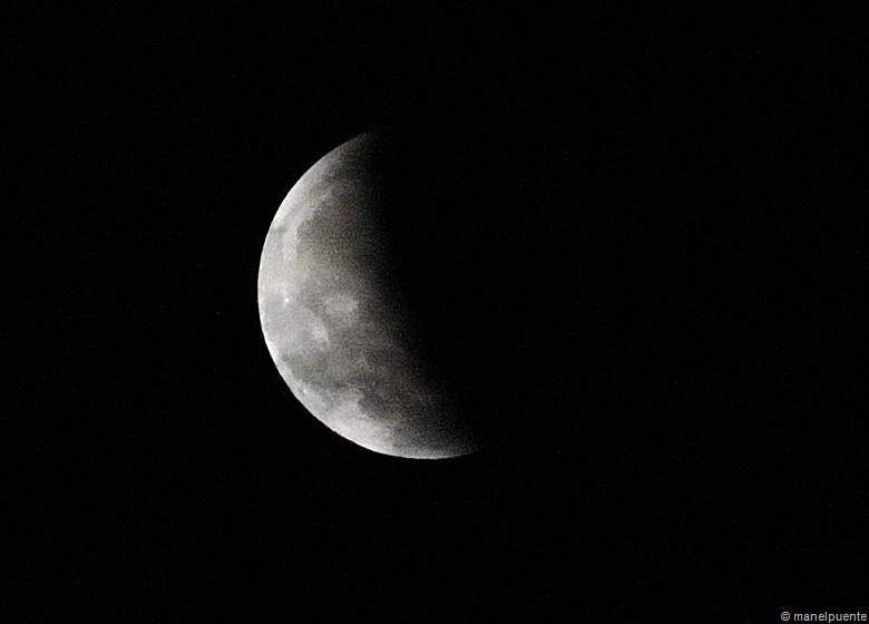 Les nostres esperances de veure un bon eclipsi de seguida es van perdre, ja que el cel estava molt tapat. Però el moment era tan especial, que no va decaure el nostre ànim, i tot i perdre’ns el moment àlgid del fenomen, passades les 23h. la lluna va decidir aparèixer fugaçment entre els núvols per mostrar-se una mica. Difícil de fotografiar sense l’equip més adequat, però contents per tenir un punt de vista tan privilegiat del moment.