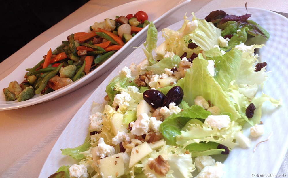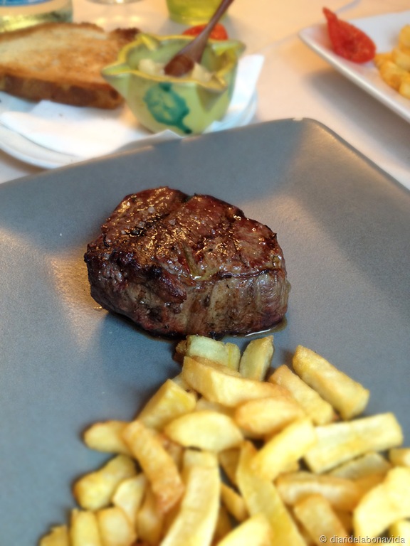 Sabem que la bona carn és cara, però com moltes vegades passa (i tornem a entrar en les opinions totalment subjectives), creiem que els preus són una mica alts. Aquesta vegada ens vam demanar una amanida amb formatge de cabra i fruits secs i un remenat de verdures amb bolets i cansalada. Les verdures, molt fresques i al punt. Molt bones. Els dos plats estaven al voltant d’onze euros cada un. De segon, un filet de bou, molt tendre i molt ben fet, a la brasa, amb patates fregides casolanes (20 euros), i unes costelles de xai realment molt bones (15 euros).