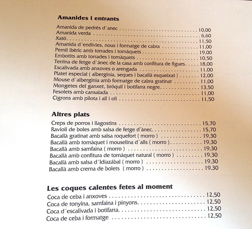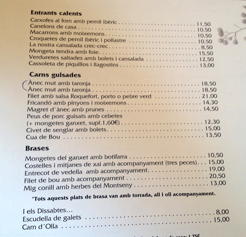 Als segons trobem, entre els guisats i les brases, carns de molts tipus: ànec, porc, vedella, senglar, bou, conill…