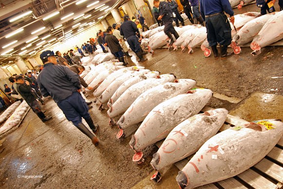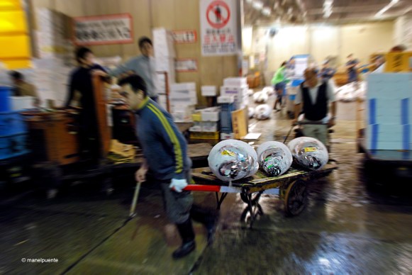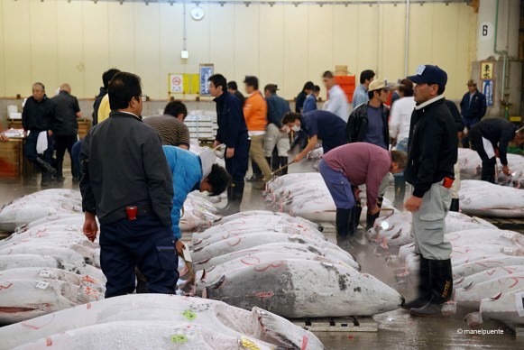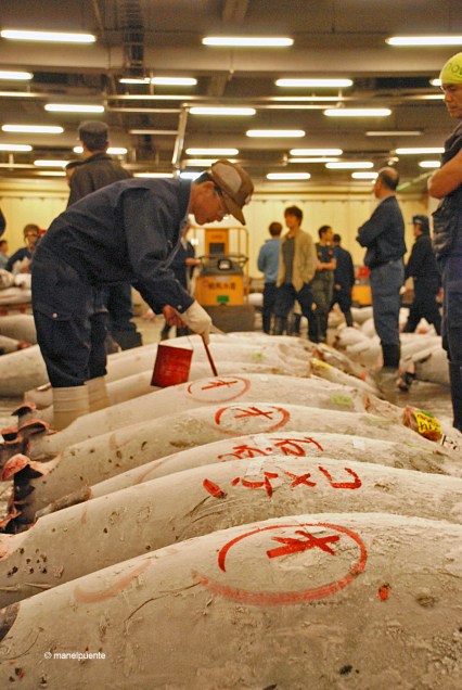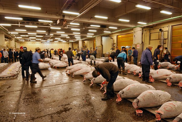 Un munt d’enormes tonyines congelades (algunes arriben als 300 quilos), són exposades al terra de la nau. Els possibles compradors passegen entre les peces repetint un mateix ritual. Les tonyines tenen un tall a la part de la cua, i els majoristes, armats amb uns ganxos, van extraient petits trossos del peix congelat, que amassen entre els dits.