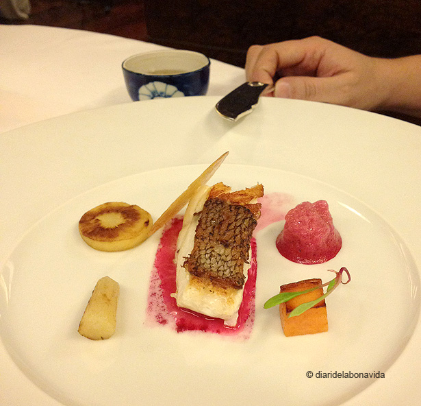 Peix de la llotja de Blanes (aquest dia era Mero) acompanyat de caldo amb pells de patates i boniatos