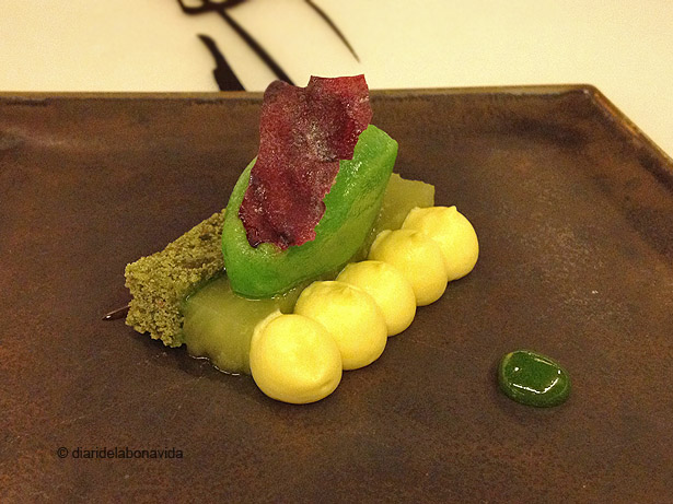 Mousse de maracujà, bescuit de te verd, pinya i gelat de rúcula