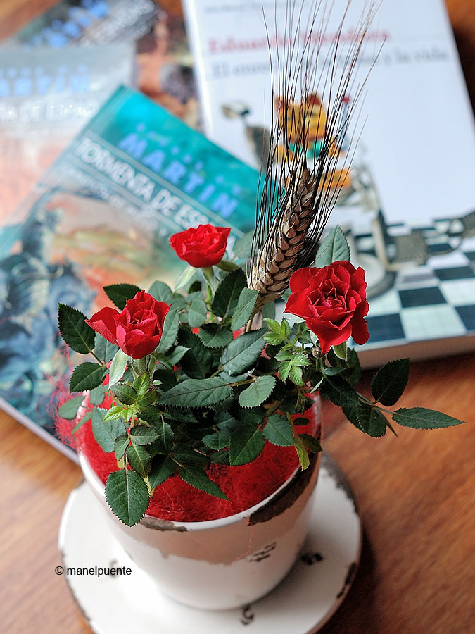 Això sí, amb la rosa si que s’ha de seguir la tradició, i sempre visitem alguna paredeta o floristeria on comprar-la. Està clar que Granollers no és Barcelona i que en poca estona ja ho tenim tot vist, però com hem dit abans, aquest any no disposàvem de gaire temps. Tornem cap a caseta amb unes roses anomenades de “pitiminí” i els llibres “El enredo de la bolsa y la vida” d’Eduardo Mendoza; i “Tormenta de Espadas” de George R.R. Martin
