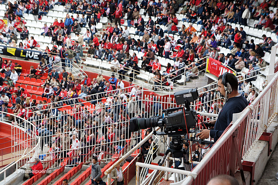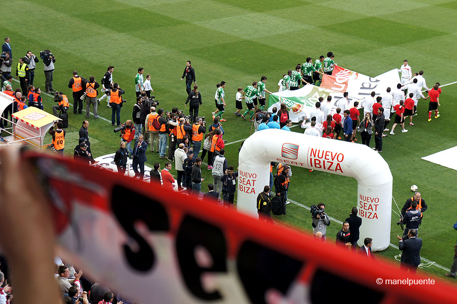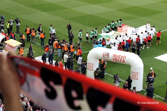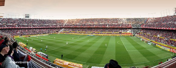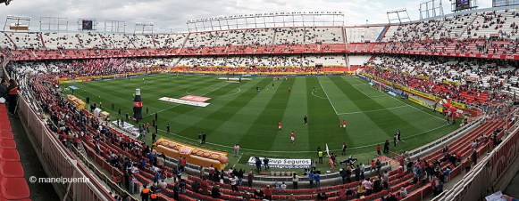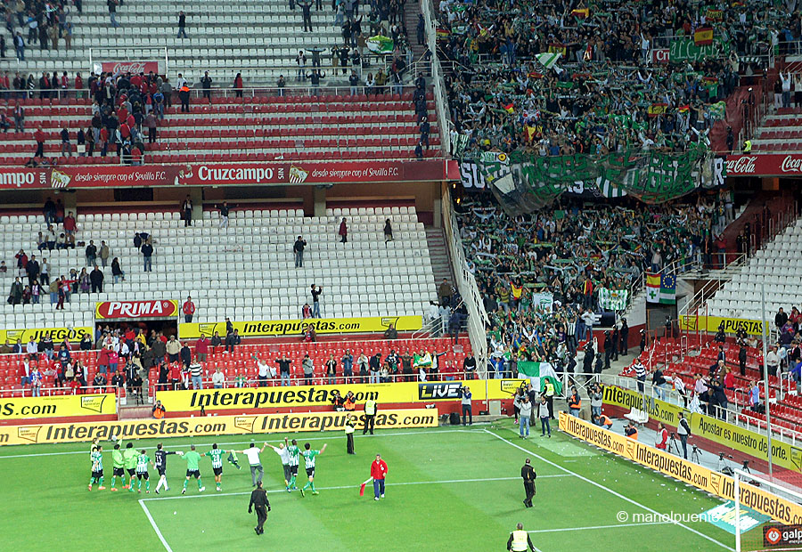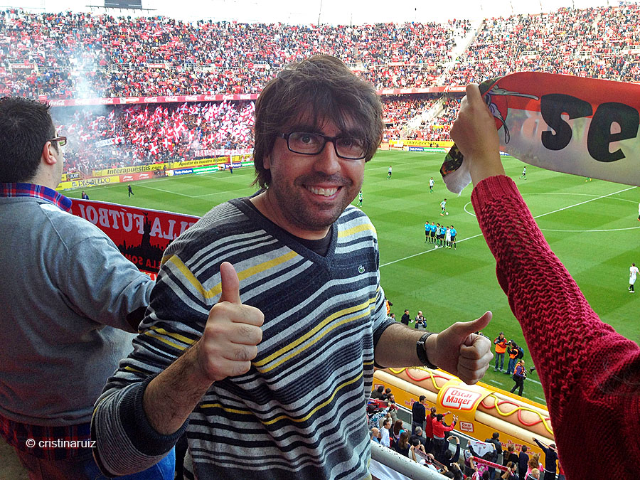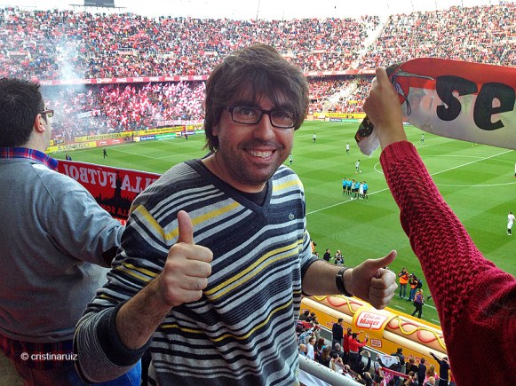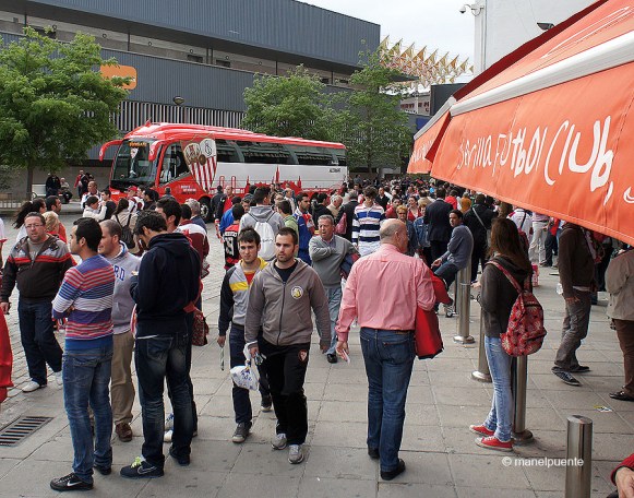 Serà la primera vegada que visitem el camp de l’etern rival, el Sevilla Futbol Club, ja que sempre que hem anat a veure algun partit del Betis ha sigut al Benito Villamarín. És un derbi especial, ja que crec que no hi ha cap altra ciutat on els dos equips tinguin tant de pes repartit entre les aficions. Podem dir que gairebé es divideixen entre meitat i meitat, inclús repartits entre famílies. Marits d’un equip i dones de l’altre, avis i néts d’un i pares i mares de l’altre, germans amb colors i sentiments diferents… Això no passa a cap altra ciutat! Fins i tot som motiu d’alegria en una taberna on dinem i se sorprenen al saber que som a la ciutat per veure el partit. El nostre accent ens delata i no es poden creure que un bètic català vingui a veure el derbi! Un somriure i una encaixada de mans de la mestressa de la taberna ens fa veure que ella també és bètica!