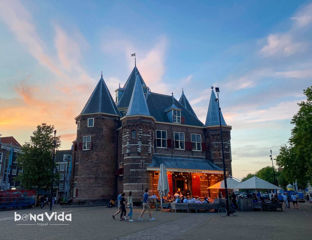 - A la Plaça Nieuwmarkt, entre el barri xinès i el barri vermell, trobem De Waag, un edifici del segle XV que sembla un castell, però acull una cafeteria i terrasses on prendre alguna cosa.