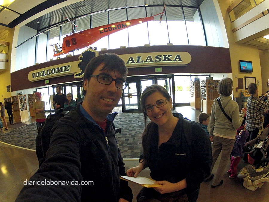 Un cop facturades les maletes i nosaltres embarcats, al cap de dues hores, arribem a Frankfurt, on fem una aturada d’una hora i mitja, abans no tornem a agafar el nostre segon avió, direcció Anchorage, Alaska. Hem de passar un altre control de seguretat i aquesta vegada és molt més exhaustiu que el de Barcelona. De fet, ens obren la motxilla de l’equip fotogràfic i ens inspeccionen mooolt detingudament l’objectiu més gros (que vist a simple vista, fa una mica de por…) i el llibre electrònic. Però res, de seguida veuen que som inofensius!