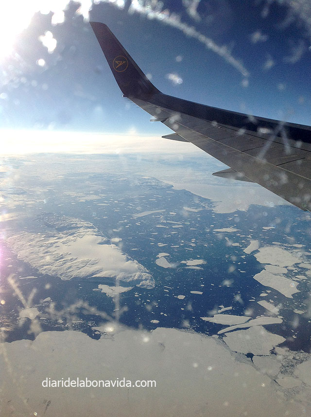 El que més ens ha fascinat del trajecte, han estat les vistes que hem tingut al moment que sobrevolàvem Groenlàndia, a tocar del Pol Nord. Espectacular! Semblava que estiguessim veient un documental en directe! El mar absolutament tranquil i el sol reflectint en els trossos i plaques de gel escampades per tot arreu. Molt maco! Només faltaven els óssos polars corrents per aquí!