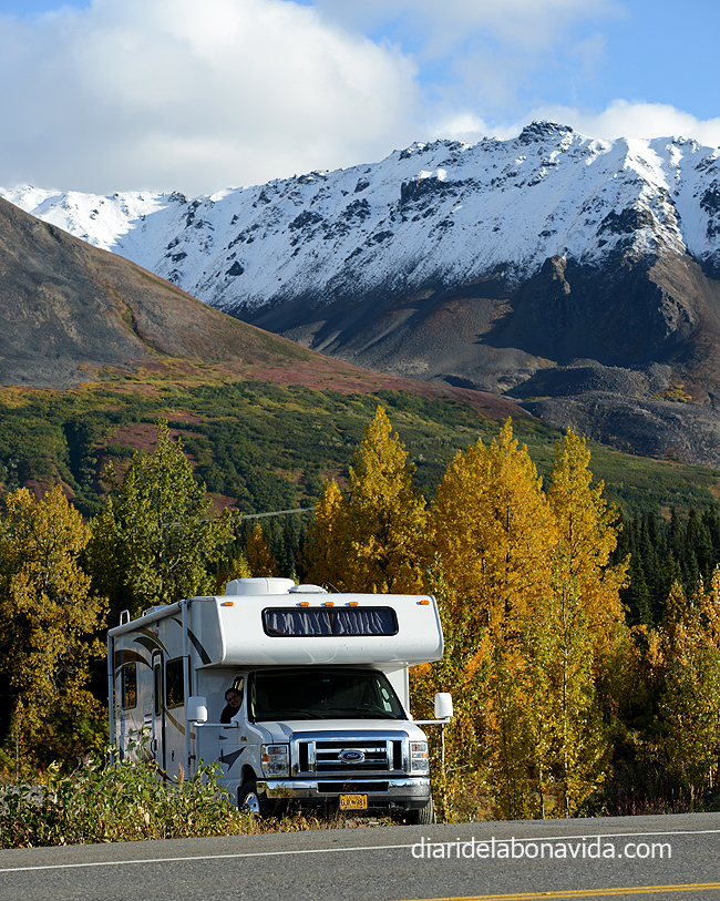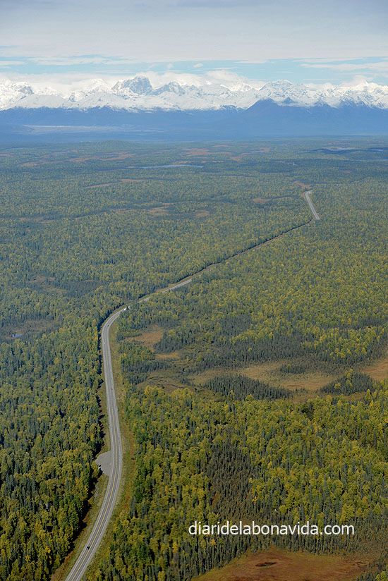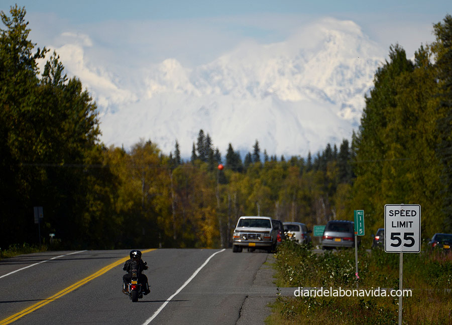 Un cop a terra encarem la ruta cap al Parc Nacional Denali, un dels més importants del país. Rodem per la Higway 3, sempre envoltats d’arbres i muntanyes nevades. Quins paisatges!