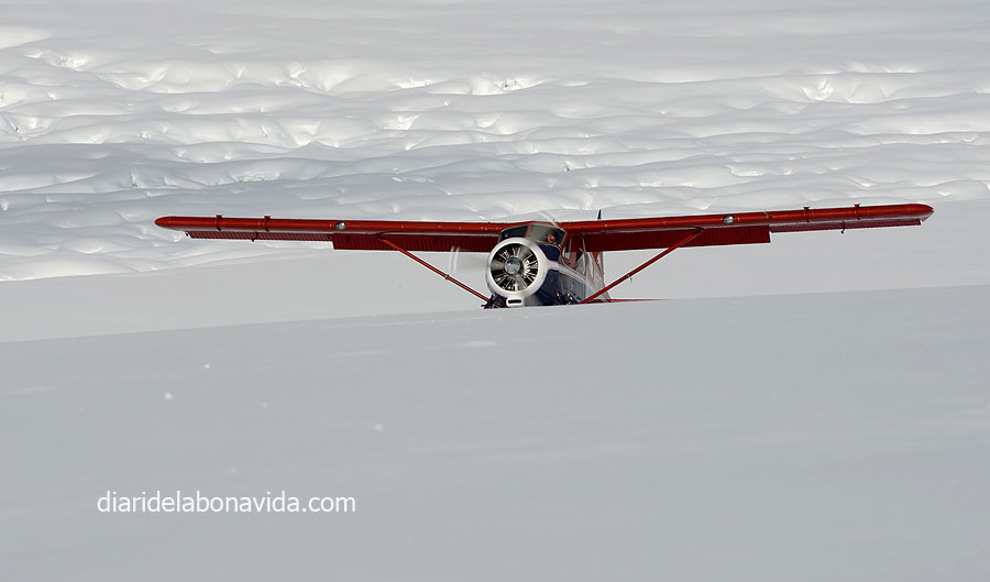 El nostra vol s’anomena McKinley Base Camp Tour i en total l’excursió amb avioneta dura una mica més de 2 hores, i és una de les experiències més increïbles de la nostra vida. Al·lucinant! El vol és una passada, però suposem que el dia tan maco que trobem és el que ha fet que sigui una jornada especial. El sol llueix al cel, i el cel, ben blau, ressalta encara més el blanc de la neu.