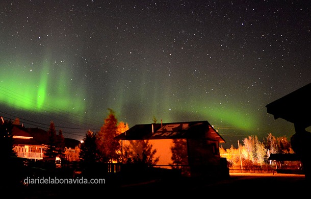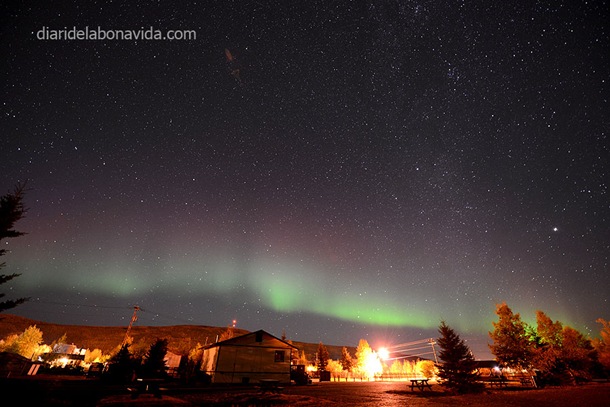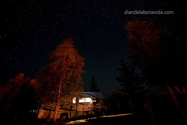 Conec a un altre campista que es passa llargues temporades aquí. I és expert en fotografia nocturna. L’home va super equipat (i més abrigat que jo). És un plaer conèixer un altre freaki! No et sents tan sol… L’hi demano si potser veurem una aurora boreal. Em diu que ell ha fotografiat moltes, i que podria ser. Passem una llarga estona sota els estels. A estones intentant entendre’ns, a estones en llargs silencis contemplant el cel. La bateria de la càmera diu prou, i és tard. M’acomiado d’ell i vaig a dormir. La Cristina ja fa estona que descansa dins la caravana. Estem a punt de caure profundament adormits, quan sentim que piquen a la porta. Fotem un bot i un bon “susto”! Obro la porta i em trobo al nostre amic que ens diu que s’està formant una aurora! Ell surt disparat. La Cristina i jo ens posem la primera roba que trobem, i sortim fora. Tornem a al.lucinar amb l’espectacle que ens ofereix el cel…