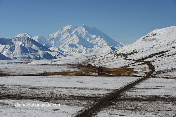 Fem unes 4 parades de 10 minuts cadascuna a diferents punts. Alguns amb bones vistes i altres amb els sempre necessaris lavabos. La nostra ruta arriba fins a Eielston Visitor Center, un modern punt d’informació, amb el poderós Mt. McKinley al davant, que per cert, tot i que ens confirmen que és difícil veure’l sense núvols, ja portem dos dies seguits fotografiant-lo ben net. McKinley o Denali, com els agrada anomenar-lo aquí. I també The Great One.