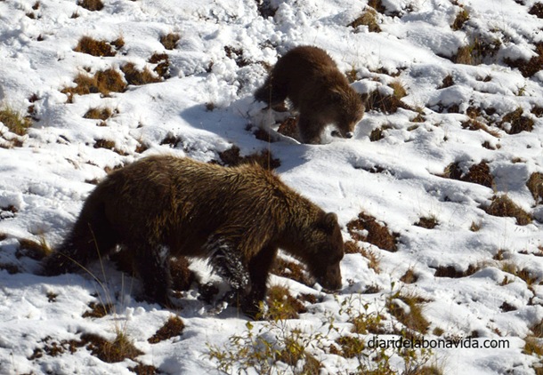 Encara tenim la sort de veure més óssos (4 en total, un d’ells amb les seves dues cries) i la veritat és que impressionen. Tot i que hem vingut amb força equip fotogràfic, trobem molt a faltar algun teleobjectiu més potent. Qualsevol càmera compacta arriba més lluny que la nostra! Però tot no pot ser…