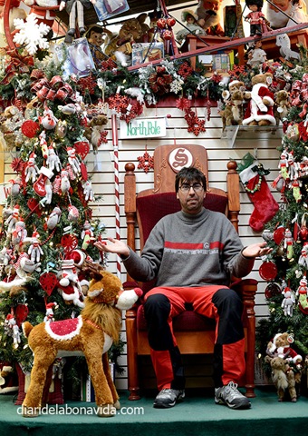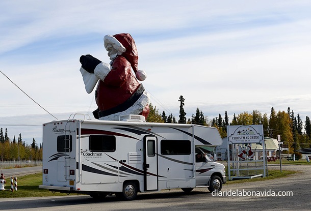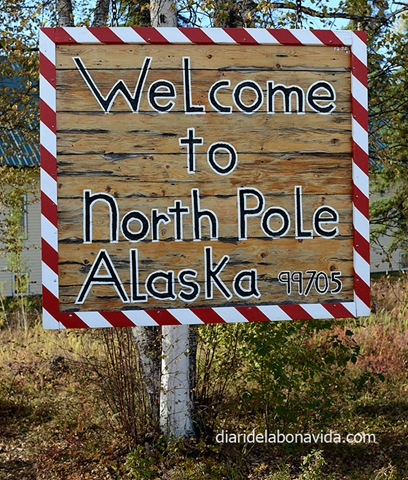 Pel camí parem al rocambolesc poble de North Pole (sí, sí, algú va tenir la brillant idea de batejar un poble amb el nom de Pol Nord). I endevineu quina és la gran atracció turística del lloc. Doncs, aquí representa que el Pare Noël té la seva oficina i rep les cartes de tots els nens del món (no sabem quantes d’aquestes oficines deu tenir repartides pel planeta…). Hi ha una super botiga on es pot trobar tot tipus d’articles relacionats amb el Nadal. Molt freaky tot plegat! I avui, dinar per tres; nosaltres dos i un Pare Noël de més de 10 metres que ens acompanya.