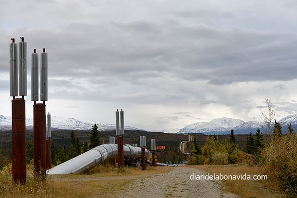 El dia continua sent clar (no ens ho acabem de creure) i hem pogut veure amb total claretat els 3 pics més importants de l’Aleska Range: Mt. Deborah (3.761 metres), Hess Mountain (3.639 metres) i Mt. Hayes (4.216 metres). També ens impressiona la “Pipeline”, la canonada que porta el petroli que s’extreu del nord d’Alaska i que arriba fins a Valdez, a tocar del mar, on des d’allà es reparteix a la resta del país en vaixell. Ni més ni menys que 1.287 kilòmetres de canonada (com si anés de Granollers a La Corunya…).