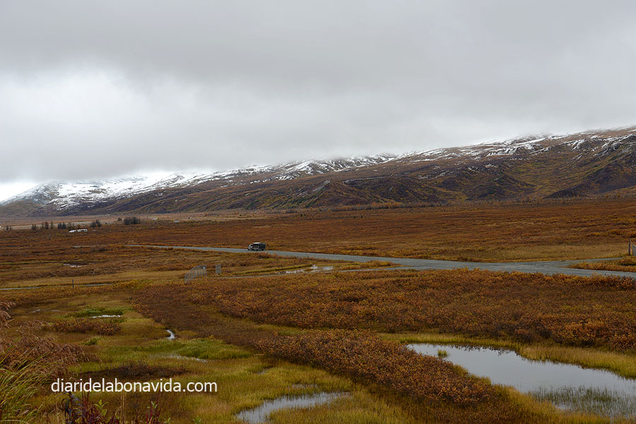 Ens prenem amb molta calma l’esmorzar. És un temps sagrat per a nosaltres! Ens posem en marxa sota un cel gris, tot i que no plou. Tot i això, la temperatura es manté com els últims dies: fresqueta durant el dia i molt freda durant la nit. Afagem la Richardson Hwy cap al sud, creuant les Alaska Range Mountains. Ens acompanya la Pipeline (canonada petrolera) gairebé tota l’estona, i hem vorejat el Summit Lake, abans d’arribar al poble de Paxson, i el Paxson Lake just després.