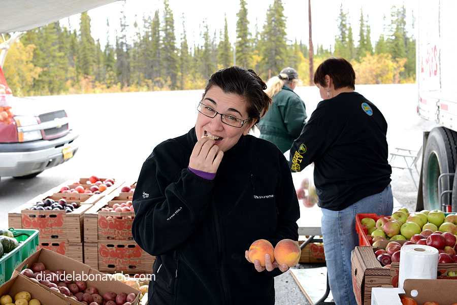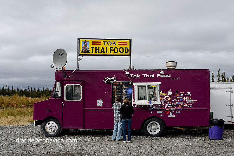 El sol va treient el cap i ens acompanya a estonetes fins arribar a Glennallen. Trobem el punt neuràlgic del “poble”, que vindria a ser una benzinera, una botiga de regals i el visitor center, on aprofitem per recollir informació de l’excursió que volem fer demà al Wrangell-St.Elias National Park Reserve. També hem trobat dos camionetes: una que serveix de tenderete per vendre fruita i verdura i una altra que ven menjar thailandès per emportar. Aprofitem per fer gasto a les dues. Comprem pomes i préssecs i el dinar thailandès al Tok Thai Food. Parem uns metres més endavant, amb unes vistes magnífiques, i aprofitem per dinar.