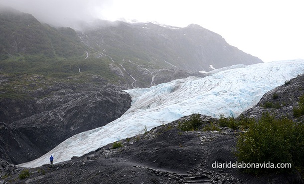 Ell ens diu que vol fer el trekking més llarg, el Harding Ice Field Trail, però nosaltres ens conformem amb una caminada més curta. Volem arribar fins al punt anomenat The Edge of the Glacier (el límit de la glacera). És un recorregut molt maco, amb una lleugera pendent que ens condueix fins a trobar-te ben a prop de l’enorme troç de gel. Uf! Impressiona. Uns cartells amb diferents anys van marcant fins on arribava la glacera, i t’adones ràpidament del retrocés que pateix el gel. Ens estem carregant el planeta!!! (Això també ens ho diuen les nostres mares…).