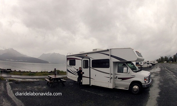 Tornem a Seward, i acampem just davant del mar, en tota una zona que la ciutat té disposada per a campistes. No està gens malament. Encarem la caravana per tal que la finestra del llit doni a l’aigua. És ben cert el que ens van dir els nostres amics Jordi i Sílvia, que van visitar Alaska fa uns anys. Les millors vistes, si visiteu aquest territori, sempre les tenen els campistes (Bona nit, mares…).