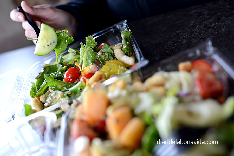 Ens aturem en un raconet, al costat del riu i ens mengem unes amanides. Als supermercats Safeway pots preparar-te-les al teu gust i les venen a pes.
