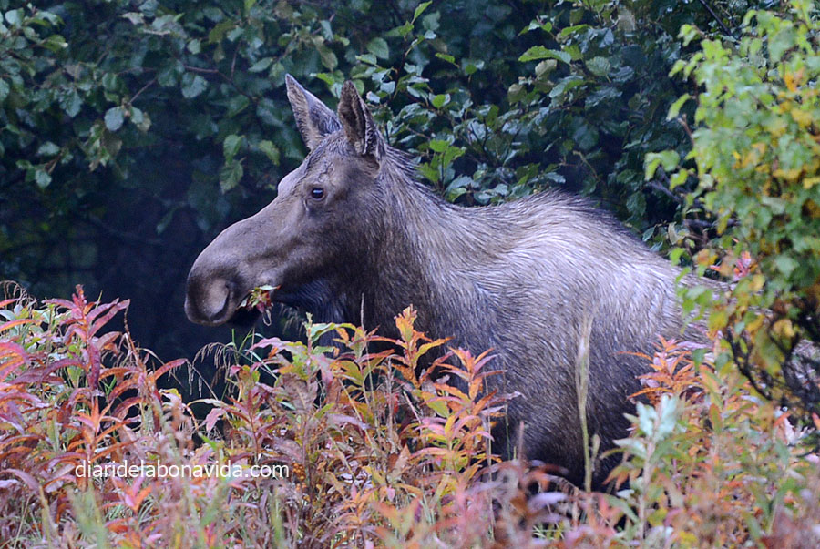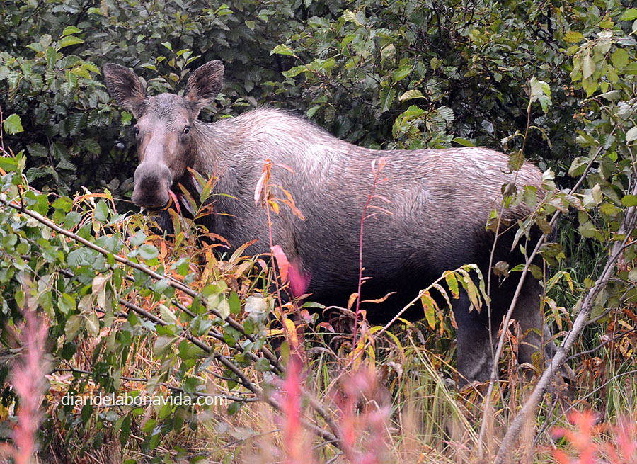 Omplim el “bitxo” de benzina i tornem a dubtar d’on passar la nit. Un primer càmping no ens convenç, i si continuem una mica més…? Ui, el següent està tancat, i si busquem un altre…? I l’ i si… ens ha portat a que s’ha fet fosc i no sabem on parar. La majoria de càmpings que tenim a la guia estan tancats per finalització de temporada. Però com que molts no estan a la carretera general, ens hem endinsat cap a la zona de boscos del poble de Kasilof. Allà, ens trobem amb una mare i una cria de Moose, i és clar, ens encantem una bona estona. Parem el motor i deixem que mengin ben a prop nostre.