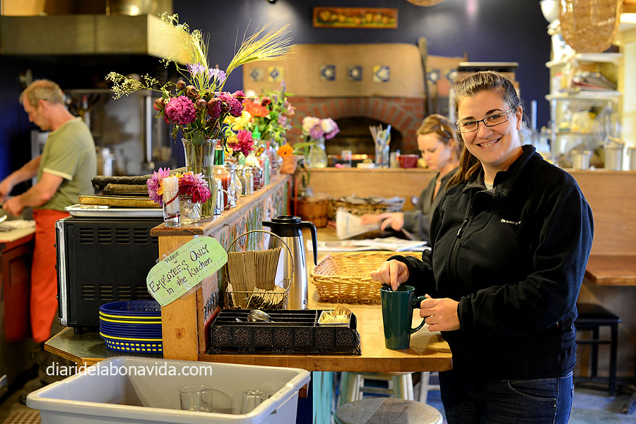 Ja que estem allà, reservem taula per demà al que ens diuen és el millor restaurant de la ciutat, el Captain Pattie’s. Decidim que aquesta nit només farem alguna cosa light, però al poble. Ja toca sopar fora de la caravana. Voltem una mica i ens atrau el Cafe Cup, on veiem gent esperant. Ha de ser bo! No tenim reserva, però ens ofereixen una bona taula deseguida. Tenim ganes d’algun sandwich i/o amanida, però quan veiem la carta no té res a veure amb això. Uf! Els plats que veiem a la resta de taules són enormes. Tot sembla magnífic. Peix fresc, bona carn, gran carta de postres… Déu meu, nosaltres no volíem, però ens han obligat a menjar com a golafres! Unes amanides de primer, i costelles i peix fresc de la zona. I ho rematem amb un pastís que no vam entendre de que era fet, però que era boníssim!
