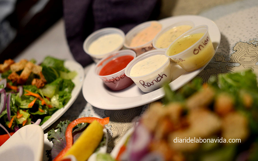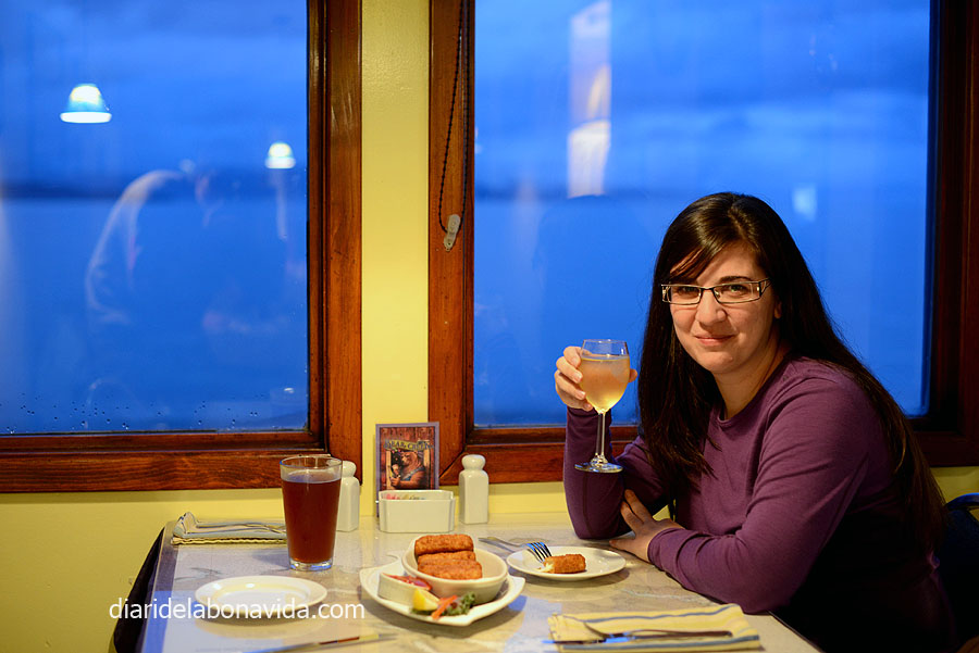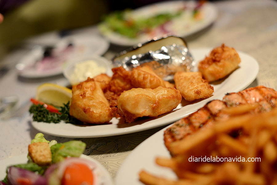 Seiem amb vistes al mar, i la noia que ens aten és super-amable. Ens decidim per un petit entrant, amanides i peix: salmó, una espècie de bacallà i el rockfish (no tenim ni idea com és deu dir en català). Hem acribillat a la noia a preguntes; tenen moltes classes de tot, de peix, de salses, d’acompanyaments… Uf! Ens demana quina salsa volem per l’amanida, i nosaltres pretenem que ens expliqui cada una. Impossible! Ens ha portat una mostra de totes amb el nom apuntat. Quina paciència, la pobra…