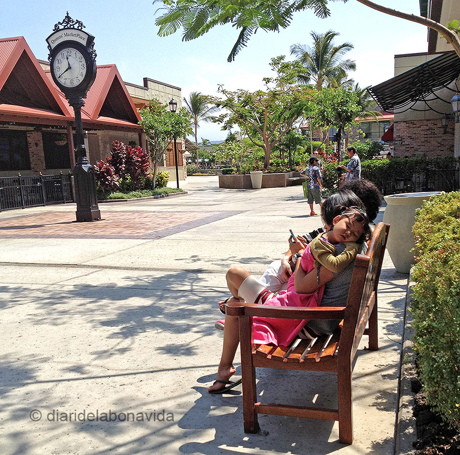 Continuem la ruta per la Carretera 19, sense rumb fix, i la gana comença a trucar a la porta. Veiem al mapa que portem, que si busquem la Waikoloa Beach Drive, trobarem una zona d’hotels de luxe i centres comercials. Cap allà ens dirigim! Sembla la nostra Roca Company Store, amb carrers amples i tot molt ben cuidat. Aquí es mouen diners, segur! Busquem la Queen’s Market Place, i dinem tipus sandwich. També aprofitem per visitar alguna botiga, comprar alguns regals per la família i el nostre sopar. És millor ser previsors, perquè no tenim ni idea de l’hora que tornarem al B&B!