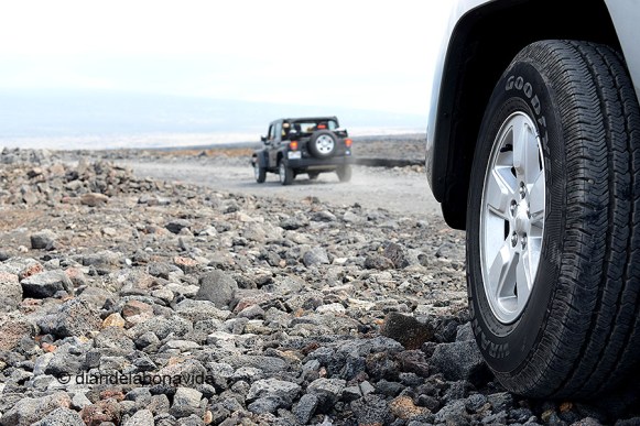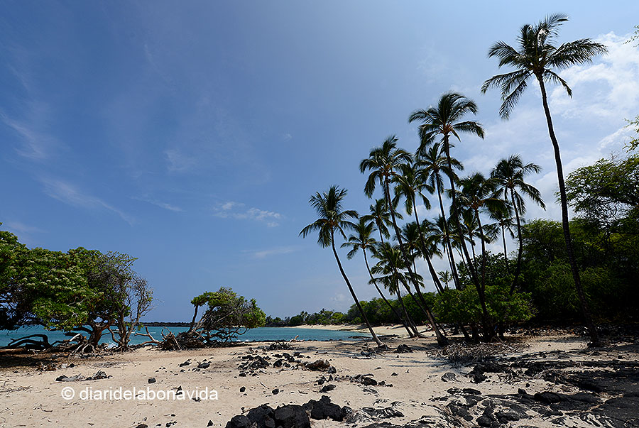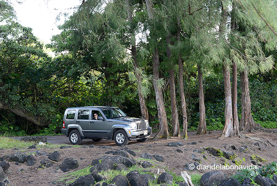 Som-hi! Agafem el cotxe i cap a la primera destinació del dia. Busquem alguna platja que ens enamori, però quan ja portem 15 minuts conduïnt, ens adonem que hem oblidat les tovalloles al B&B. Total, que ni els dies que ens llevem d’hora som capaços de posar-nos en marxa ben d’hora… Ens dirigim a la platja de Mahai’ula Beach, i agraïm portar un 4×4. Les 3 milles que separen la carretera de l’aparcament són un camí dolentíssim, ple de pedres, roques i sots.