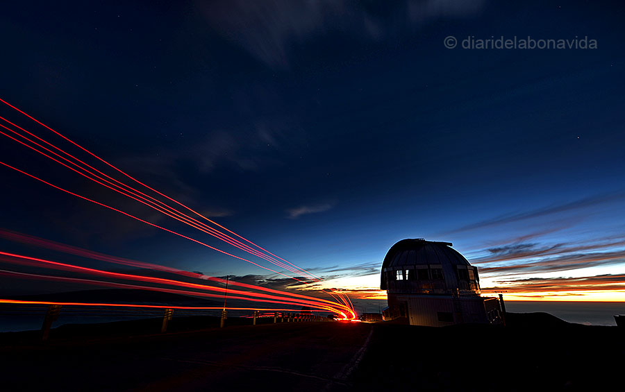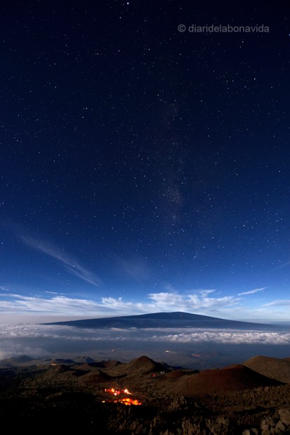 Iniciem el descens, molt més lent i tranquil, cap al Visitor Center, però abans ens aturem a mig camí per contemplar el magnífic cel estrellat que ens envolta. El Mauna Kea és un lloc ideal per les observacions astronòmiques. El seu cim, molt accessible per carretera, es troba més amunt del 40% de l’atmosfera, i això permet més de 300 nits netes i clares a l’any.