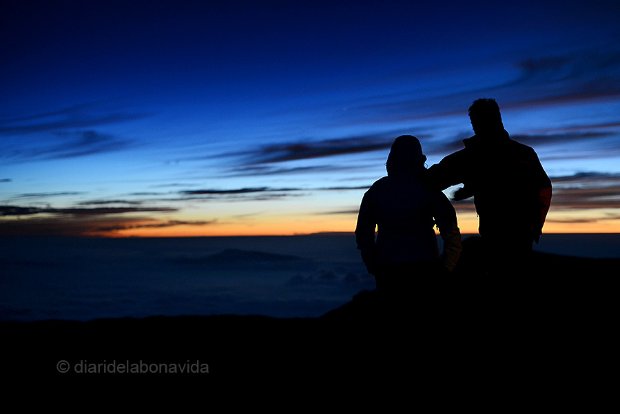 I allà hi era, davant nostre, una de les visions que sempre recordarem de Hawaii: els núvols sota nosaltres, el sol deixant escapar els darrers raigs del dia, un color taronja intens que embolicava tot el cim… Ho havíem aconseguit!!! Això sí, pujar més amunt dels 4.000 metres tant ràpidament ens va començar a afectar. Voltàvem amunt i avall per veure l’espectacle des de tots els punts de vista, i encara que les nostres cames responien bé, semblava que havíem fet una marató. La respiració era ràpida i pesada, ens costava respirar, i un cert mareig ens afectava. Estàvem patint el mal d’alçada??? Segurament… A més, feia un fred terrible!!