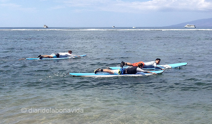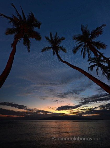 El sol s’amaga, i tornem cap al poble de Lahaina, per gaudir d’una bonica posta de sol. És llavors, quan la llum marxa, que el poble s’activa més que mai, i els turistes i locals comencen una cerimònia rutinària: voltar amunt i avall pel passeig marítim i omplir restaurants i botigues. Els imitem durant una bona estona, però ens recollim aviat, demà hem decidit matinar molt per una activitat molt important. Tot i que encara ens reservem una estoneta per un bany a la piscina de l’hotel. Ah! Això és vida, sí senyor…