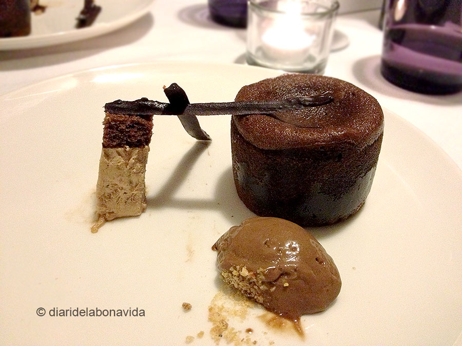 Tot seguit ens van servir una porció de formatge de Sort amb trufa, molt ben equilibrat i amb un toc diferent. De postres, una mousse de maduixa amb gelatina de Caipirinha al fons, que no ens va agradar gens. La mousse estava ben feta, però la combinació amb la gelatina no tenia molt de sentit… Vam rematar la feina amb un coulant de xocolata negra, amb xocolata blanca per dins. Molt bo, però no ens el vam poder ni acabar!