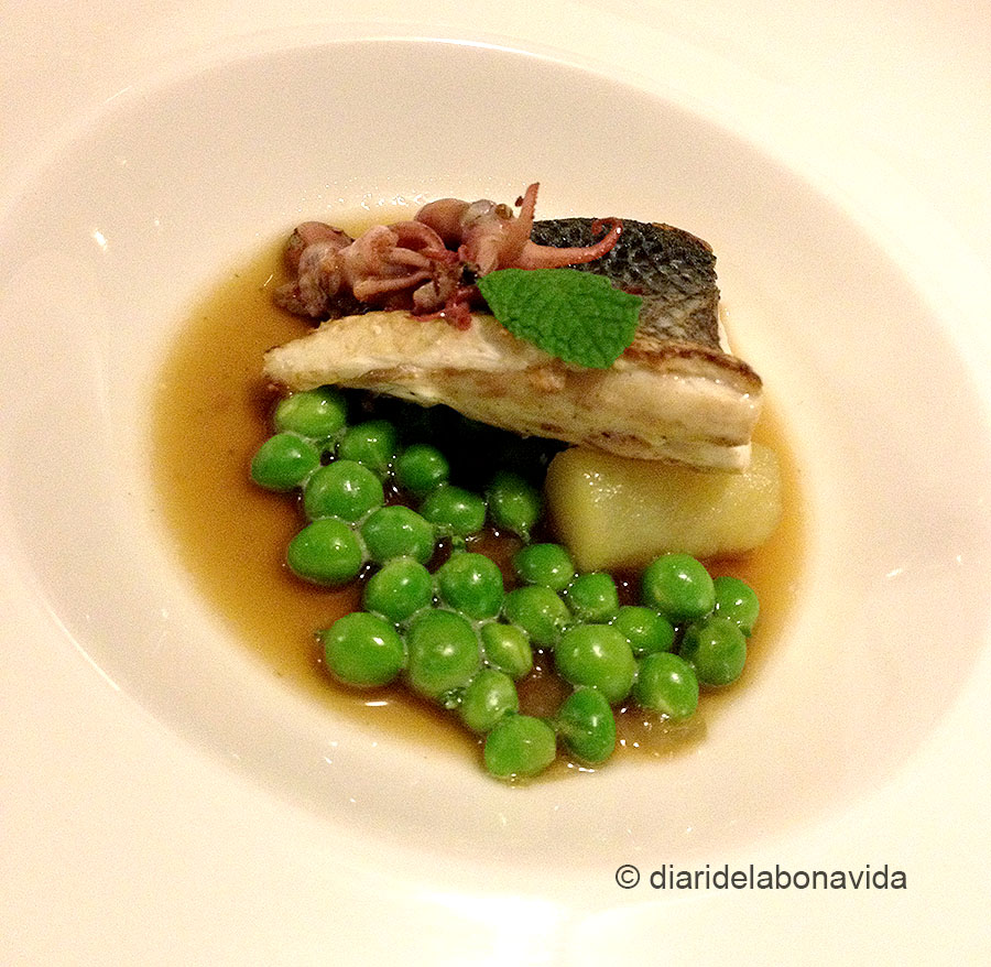 I de segon, un peix de platja, que aquesta vegada era un llobarro amb pèsols, que estava molt ben cuinat. I per acabar amb els plats principals, un garrí de Segòvia. Va ser com uns focs d’artifici! Espectacularment ben cuinat, tendre per dins, torradet per fora, amb un gust realment ben aconseguit.