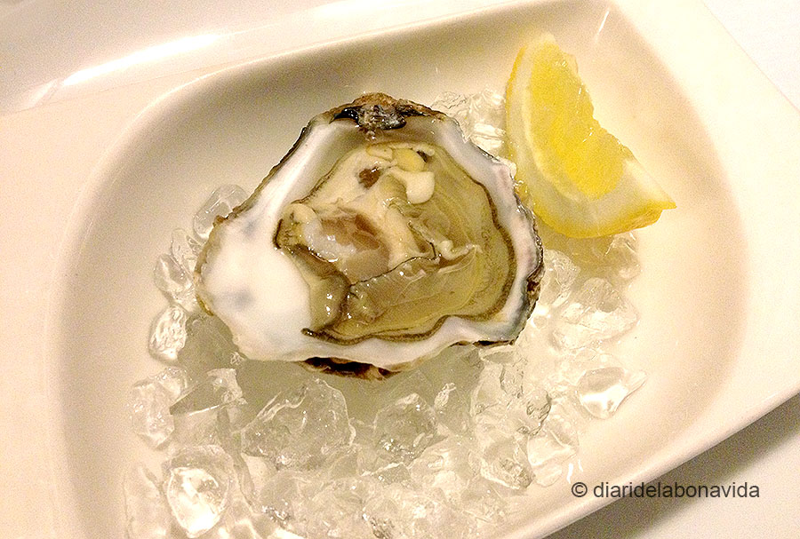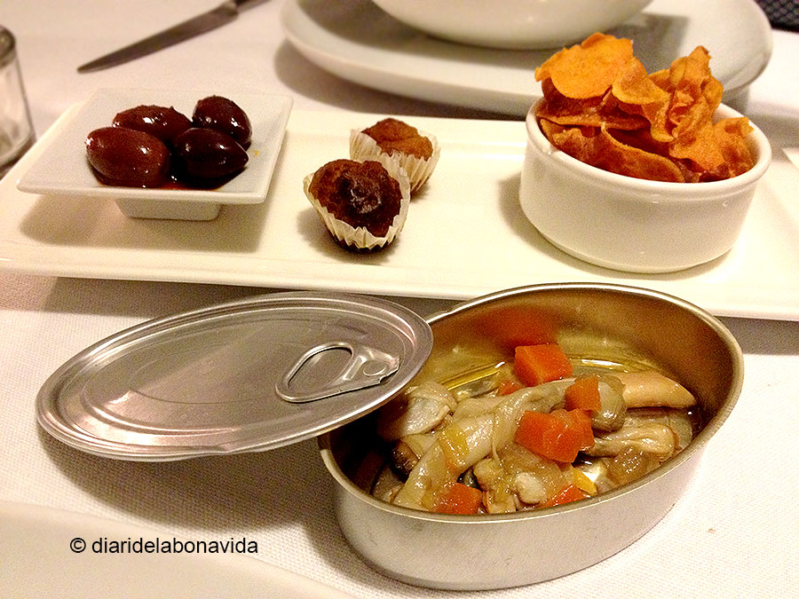 Els aperitius eren força senzills, pel que és el menú en general. Unes olives, unes xips de moniato, una mini-llauna de navalles en escabetx i unes magdalenes de pizza (que per cert, no ens van agradar gens; eren dures i no tenien gust a res). Però després va arribar l’ostra, un complement d’aquests primers aperitius, i la veritat és que era espectacular.