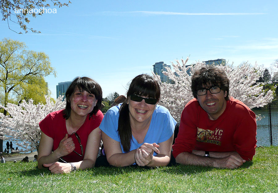I és que els Cherry Blossom és un dels moments més esperats pels habitants de la ciutat, que relacionen el floriment dels cirerers amb l’arribada del bon temps. I quin temps!!! Ens vam trobar un sol i un dia espectacular durant la nostra excursió pel parc. Aquesta afició, que prové de països orientals com Corea i sobretot el Japó, on es coneix com a Sakura, s’ha acabat implantant aquí, i realment és una delícia. De fet, van ser els propis japonesos qui van plantar el primer cirerer el 1959. Ara n’hi ha més de 30, i quan comença el bon temps (finals de març-abril), el parc ofereix una suma d’imatges maquíssima: el llac Ontario, el verd de la gespa, i les fulles blanques i roses dels cirerers.