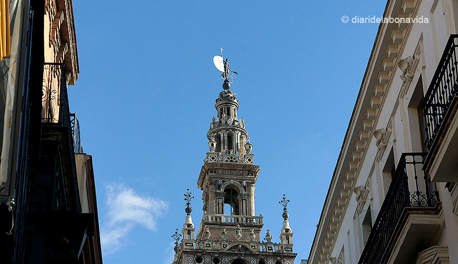 La seva torre i campanar forma part de la visita que es pot fer a la Catedral, i fer l’esforç de pujar els seus 104 metres d’alçada té la recompensa d’unes bones vistes de la ciutat. El minaret està construït a semblança del de la Mesquita Kutubia de Marrakech (Marroc), tot i que unes campanes a la seva part superior i una estàtua coneguda popularment com “El Giraldillo” que corona La Giralda la fan única i diferent. La seva planta és quadrada i una rampa sense escales, puja fins a dalt de tot.