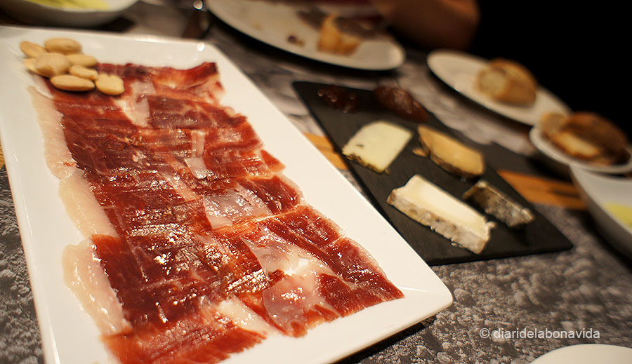 Però parlem del més important, el menjar. La carta ens mostra una llarga varietat de plats, que podem optar per compartir si ens ve de gust. Això és el que fem nosaltres, uns platets de primer, un plat principal de segon i unes postres. Per començar podem triar entre boníssims pernils, formatges, amanides, croquetes, ous… Diferents tipus de carn i peix com a plat principal i, encara que no molta varietat de postres, ens va encantar els que vam triar. Tot acompanyat de vi, és clar, perquè si una cosa té sobretot d’especial aquest lloc, és el vi.