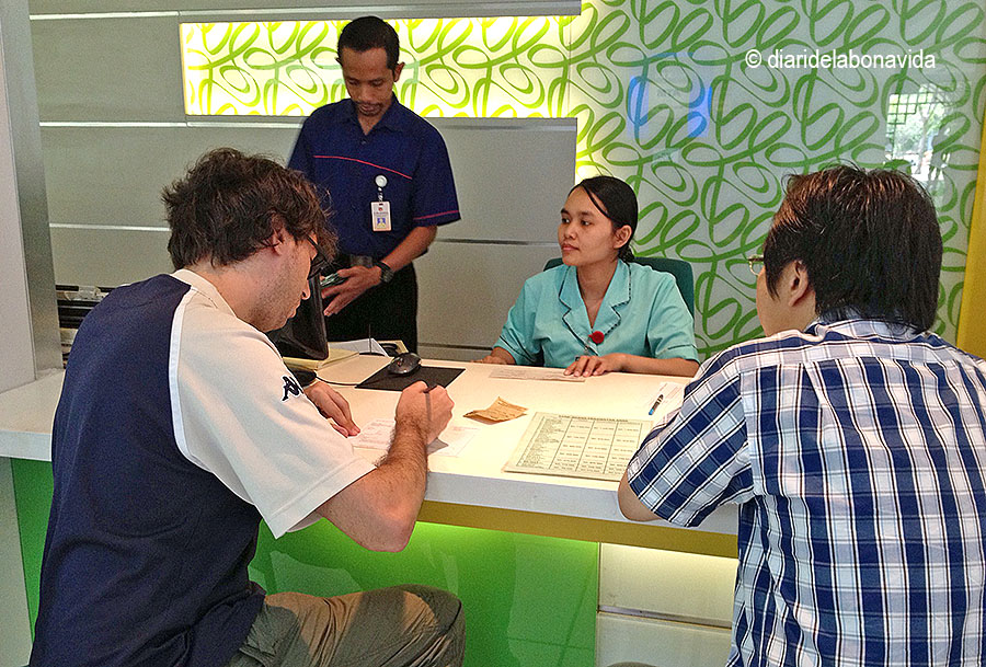 Ens fan omplir uns papers, però està en indonesi i les noies de recepció no parlen anglès. Primer problema: com omplim això? Per sort un pacient del costat ens ajuda i ens tradueix tot el que ens diuen. Entrem a la consulta i ens passa el mateix. L’infermera no para de riure però no sabem què diu. Per senyes ens entenem. Finalment arriba el doctor Sura, que en un anglès perfecte ens atén a la perfecció. Una contractura molt gran. Una injecció antiinflamatòria i unes quantes pastilles. Apa! Sortim d’allà ben contents!