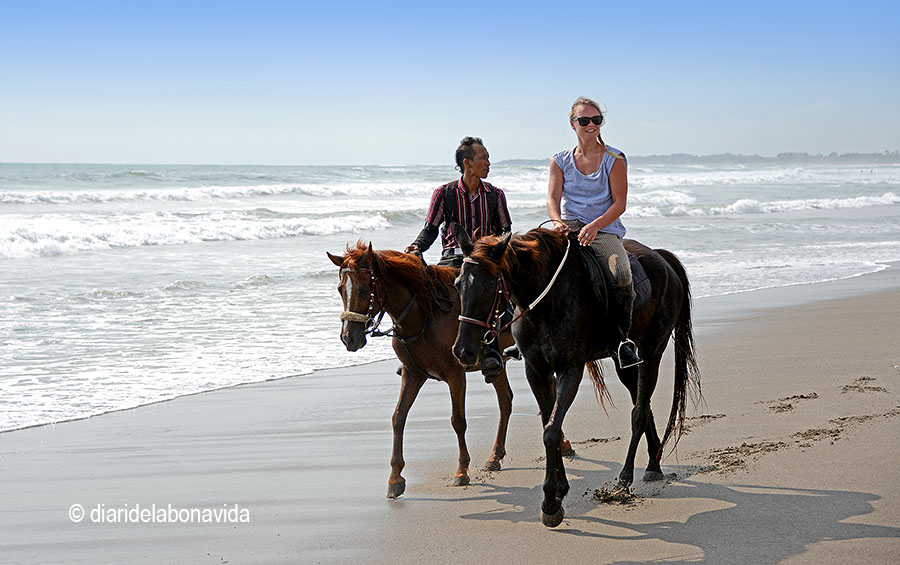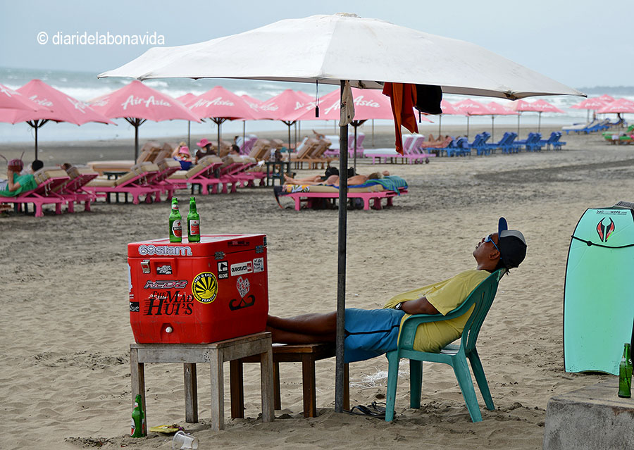 La platja de Seminyak està força bé. Són 4 quilòmetres de sorra que permeten llargues passejades. El primer dia que la visitem fa molt de vent i les banderes recomanen no banyar-se, però la resta de dies són molt millors per fer un banyet. Si fa vent, els surfistes aprofiten per cabalgar les onades, i nosaltres per observar-los.
