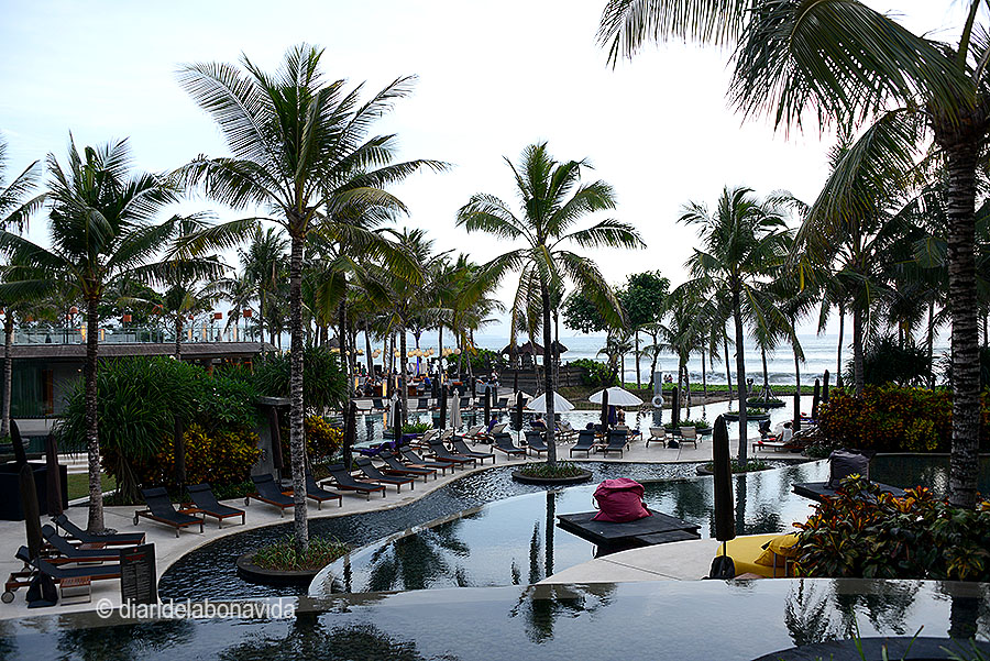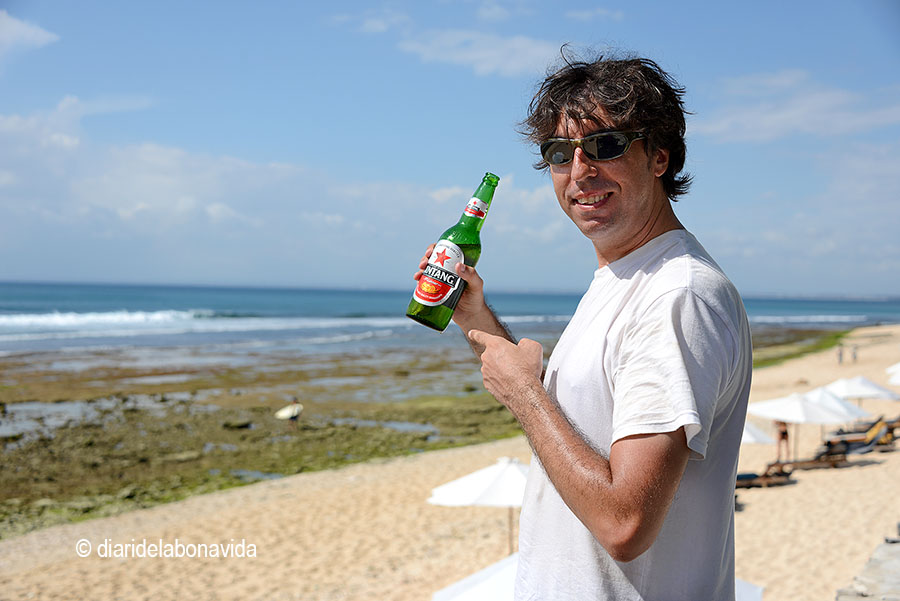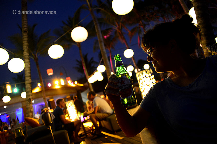 L’hotel és tan gran, que no trobem la sortida. Donem voltes, i arribem a la zona del bar exterior, amb una animació tremenda. Llums, un munt de gent i una Dj’s punxant música. Què carai, decidim quedar-nos i fer un beure! No anem molt vestits per l’ocasió, és clar, però disimulem el millor que podem. Però només portar la carta, ja veiem de quin peu calcen… Quin preus, mare meva! Au, unes cervesetes per disimular. Je, je… Això dels preus és curiós. Tot i estar en un lloc tan luxós, continua sent més barat prendre una cervesa aquí que a casa nostra, però després d’uns dies per Indonèsia, el valor dels diners canvia. En llocs poc turístics, les coses són increïblement barates, però quan es tracta de llocs on només trobes guiris, els preus es disparen. A més, la moneda indonesia no ajuda gaire. Els preus es mouen en xifres estratosfèriques, plenes de zeros. Més o menys 1 euro són 15.000 rúpies. Doncs allà ens teniu, prenent les Bintang (cerveses balineses) davant la platja, en un hotel al.lucinant, amb música de fons. Desconnectem de tot!