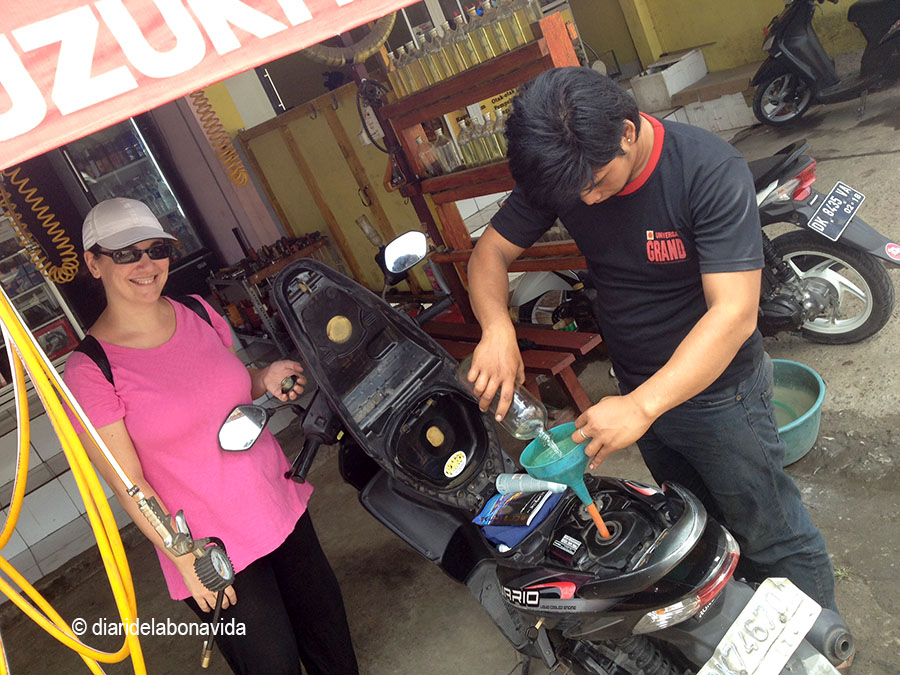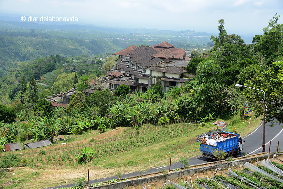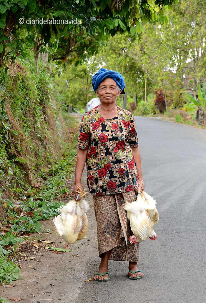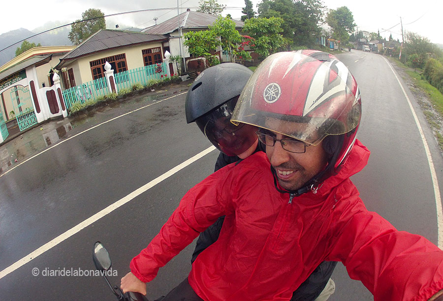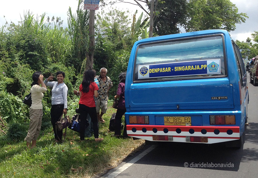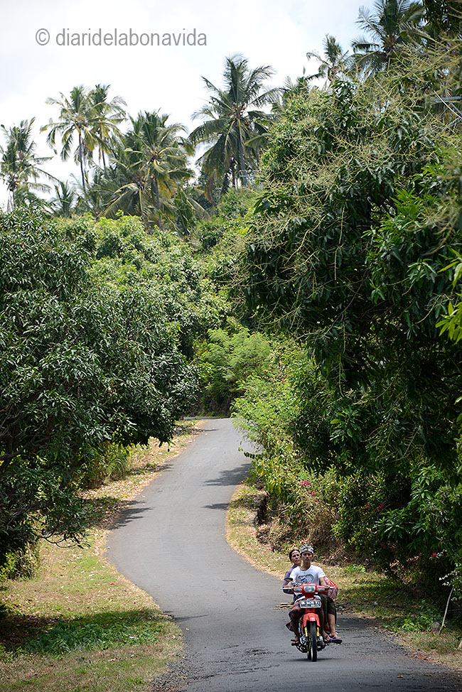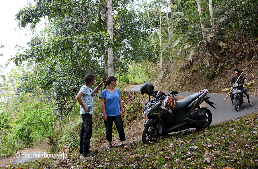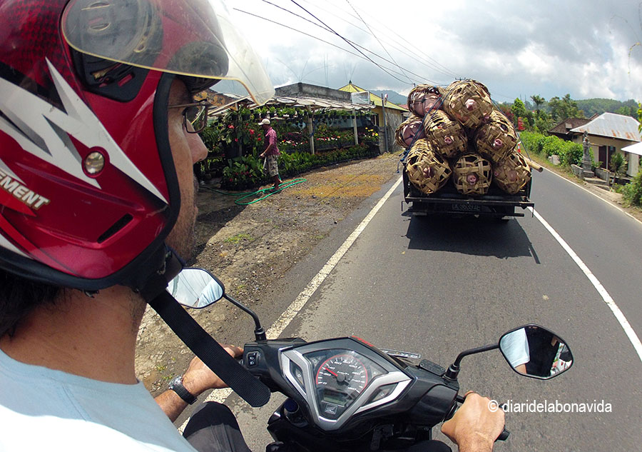 Sortim de la ciutat d’Ubud (interior de Bali), on és molt fàcil llogar vehicle. La majoria de turistes pacten preus amb conductors que els porten allà on vulguin, i tornen a pernoctar a la ciutat, però hem trobat més interessant moure’ns en moto (una scooter de 125 cc) i dormir allà on ens vingui de gust. S’ha de vigilar molt, perquè la conducció, a més de ser per l’esquerra, és molt temerària, i tot i no correr en excés, avancen per tot arreu.