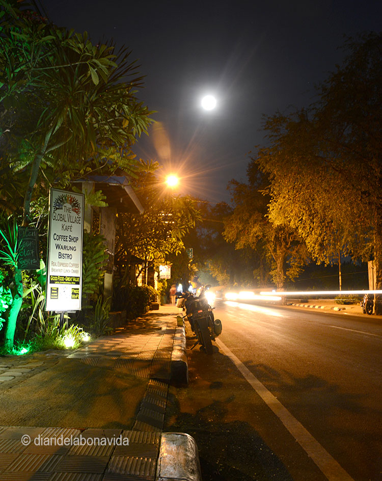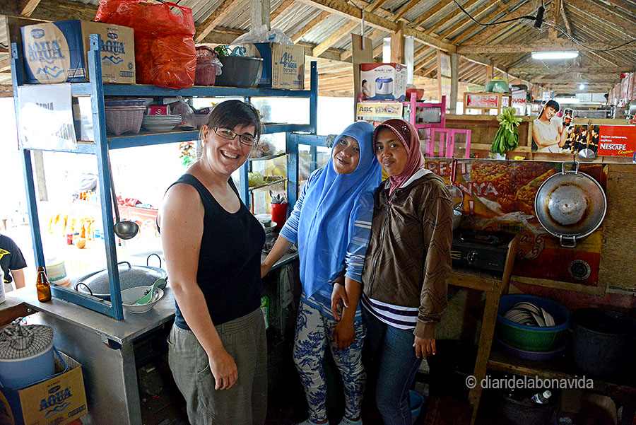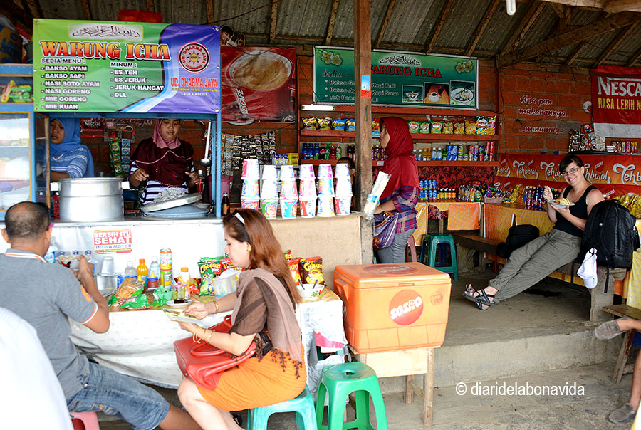 Tenim gana, però decidim fugir dels restaurants que hi ha a la zona, semblen massa turístics. I acabem al pol oposat, un lloc on no entenem la carta i amb prou feines ens entenen a nosaltres. Doncs apa, a demanar l’únic que sabem dir en indonesi, el nasi goreng que tan ens agrada. -‟No spicy”- ens diu la senyora. I a la primera cullarada ja ens cau la llagrimeta del picant…