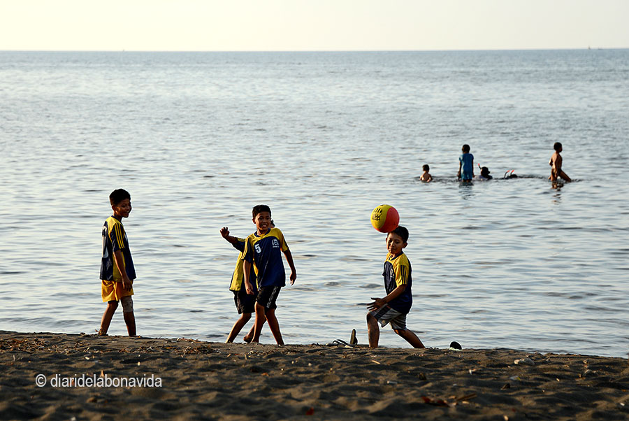 La propera parada és el poble coster de Lovina, al nord de Bali. El lloc no ens atrau gaire, però ja comença a ser tard i hem de buscar parada i fonda on passar la nit. Com si ens llegissin el pensament, i encara circulant, molta gent se’ns apropa en moto per guiar-nos allà on volguem i proposar-nos hotels i guest houses. Ens expliquen de tot i ens donen targetes d’establiments mentre conduïm. Però primer, volem veure la platja quan està marxant el sol, és l’hora que més ens agrada. Aparquem a la mateixa sorra i caminem una estoneta, entre alguns banyistes, la majoria nens.