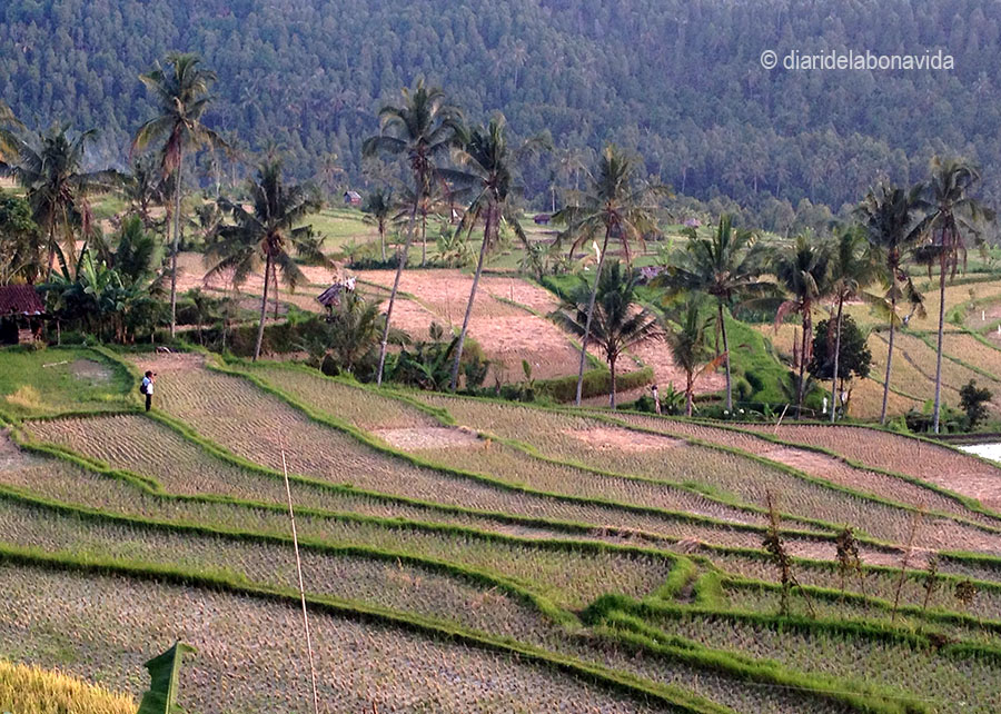 Al dia següent continuem baixant per la costa i més tard cap a l’interior de l’illa de Bali. Més poblets i mercats. Arribem al poble de Munduk i ens encantem fins al capvespre observant els arrossars. Els cultius són rotatoris i es poden veure les diferents etapes de l’arròs, i totes tenen el seu interès. Però amb la llum tan maca que trobem ens crida l’atenció els que estan recoberts d’aigua. La Cristina es queda en un caminet amb la moto, i jo decideixo endinsar-me als camps. Sembla un laberint, perquè no es pot caminar en línia recta, si no que s’ha de vorejar les diferents terrasses d’arrossars. Ups! pel camí em trobo una senyora que s’està banyant a la sèquia que porta l’aigua als cultius. Perdoni!!!! No miro!!